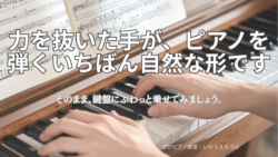 演奏のフォーム ピアノを弾く手の型は、力を抜いて垂らした手を鍵盤にふわっと乗せた時の形。 ピアノ初心者さんが手をこわばらせてしまうのは自然なこと。力を抜いて垂らした手を、そのまま鍵盤にふわっと乗せた形が基本のフォームです。無理なく身につく、やさしい手の構え方を紹介します。 演奏のフォーム