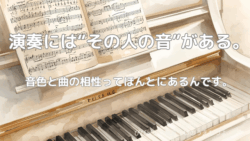 音楽小ばなし 演奏には“その人の音”がある。音色と曲の相性ってほんとにあるんです。 ピアノの音色は、その人だけの個性が表れる場所。優しい音、張りのある音、どちらもその人だけの響きです。似合う作曲家や曲調があることも。演奏を通して自分らしさに気づく、大人のピアノにぴったりなお話です。 音楽小ばなし