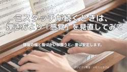 演奏のフォーム ミスタッチが続くときは、弾き方より「鍵盤の幅」と「指遣い」を見直してみて 音の場所は分かっているのにミスタッチが多い…。そんなときは、弾き方より「鍵盤の幅」と「指遣い」を見直してみましょう。感覚のズレを整えることで、演奏は自然と安定していきます。 演奏のフォーム
