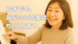 音楽小ばなし ピアノは片手でも大丈夫!弾き語りで自由に音を楽しもう 「両手で弾けないとダメ」——そんな思い込みはいりません。片手でも、和音だけでも、あなたの“弾きたい気持ち”があれば十分に音楽になります。この記事では、弾き語りの魅力と、片手演奏がもたらす自由さを、大人初心者さんにやさしくお伝えします。 音楽小ばなし