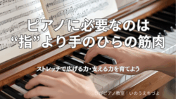練習方法 ピアノを弾くために、鍛えたいのは手のひらの筋肉。 ピアノは“指の筋肉”を鍛えるより、手のひら全体で支えて弾くことが大切。和音や押さえの安定には手のひらの筋力が欠かせません。どこを意識して鍛えれば良いのか、簡単なストレッチと一緒にやさしく解説します。 練習方法