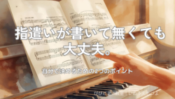 弾き方のポイント(初心者) 指遣いを自分で決める場合大切な2つのポイントはこれです。 楽譜によっては、指遣いが書いていないものがあります。そういう場合は、自分でつける必要がありますね。その時に注意して頂きたいポイントについて書いています。指遣いが書いていない曲に、自分で指遣いを考える場合、大切な事は、自分の指を見なくても、動かしたい指が動かせる事と、その場で使える指を動かす事が出来るようになる事です。 弾き方のポイント(初心者)