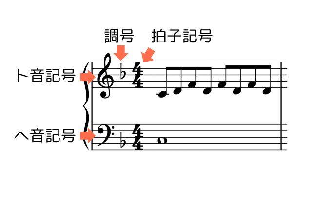 最初に書いてあるのがト音記号・ヘ音記号。