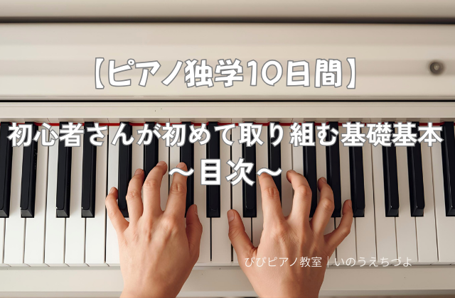 ピアノ独学10日間|初心者さんが初めて取り組む基礎基本〜目次〜 2021.12.302025.08.10 〜目次〜 1、ピアノ独学1日目|ピアノを弾くための指づくりをしよう 2、ピアノ独学2日目|指を数本ずつまとめて動かせるように練習しよう 3、ピアノ独学3日目|手の形が上達のカギ!痛みのない弾き方を解説 4、ピアノ独学4日目|弾きにくいと感じたら見直す3つの弾き方 5、ピアノ独学5日目|弾きやすくなる椅子の高さと座り方の基本 6、ピアノ独学6日目|ピアニストを真似して演奏への気構えをイメージする 7、ピアノ独学7日目|演奏を素敵にする為の音の切り方を学ぼう 8、ピアノ独学8日目|独学でのオススメの基礎教材は、これ!十分上達が見込めます。 9、ピアノ独学9日目|音楽を素敵に表現する為にペダルのタイミングを練習しよう! 10、ピアノ独学10日目|演奏に心があれば、独学でも素晴らしい演奏になる!