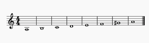 短調の場合は、「音階での7番目の音が半音上がる」ので、イ短調の場合、ソの音にシャープが付きます。↓ついている音階が短調の音階です。