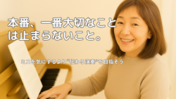 練習方法 完璧じゃなくていい。ピアノ本番で大切にしてほしいこと 本番で緊張して止まってしまう…そんな不安は誰にでもあります。大切なのは「完璧さ」よりも、止まらずに最後まで流れをつなぐこと。通し練習や“止まらない練習”のコツを、初心者さんにもやさしく解説します。 練習方法